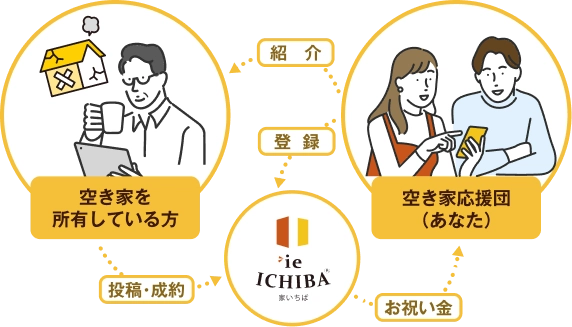 「空き家応援団」とは、登録したあなたが、空き家所有者様に「家いちば」を紹介し、 紹介者様が「家いちば」に物件を掲載、成約するとあなたに「お祝い金」が付与される仕組みです。