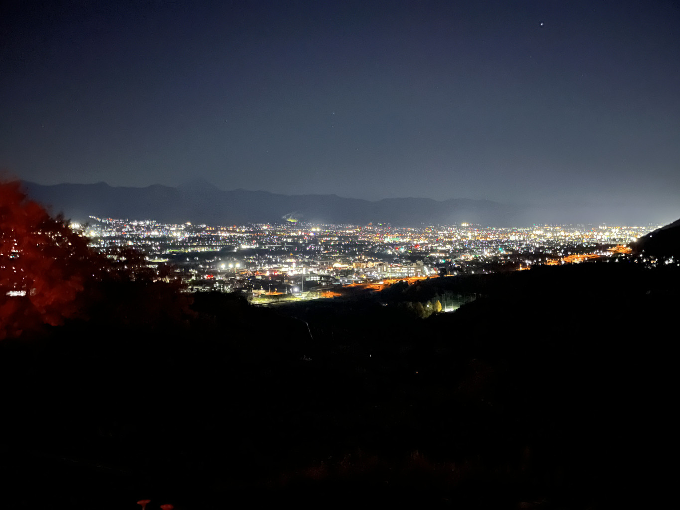 地元の人がよく行くようなお店でお昼を食べると、この土地の大地の恵みを感じます。県名を冠した市であるが、県庁所在地でなく、人口もかなり減って3万人くらいの小さな町です。それでも豊かさを感じます。東武鉄道を興して「鉄道王」と呼ばれた根津嘉一郎の出身地で、市内に根津記念館という旧家と美しい庭園が残されていて、かつては甲州財閥と呼ばれ、明治から大正にかけて中央財界に大きな影響力を与えたものです。その過去を思うと、今のひっそりとしたこの地域のようすが拍子抜けのように思えます。すり鉢のような形をした地形であるため、少し斜面を上ると、どこからでも盆地全体の夜景を眺めることもできます。そこから生まれる一体感も、この土地の心地よさになっていると思います。